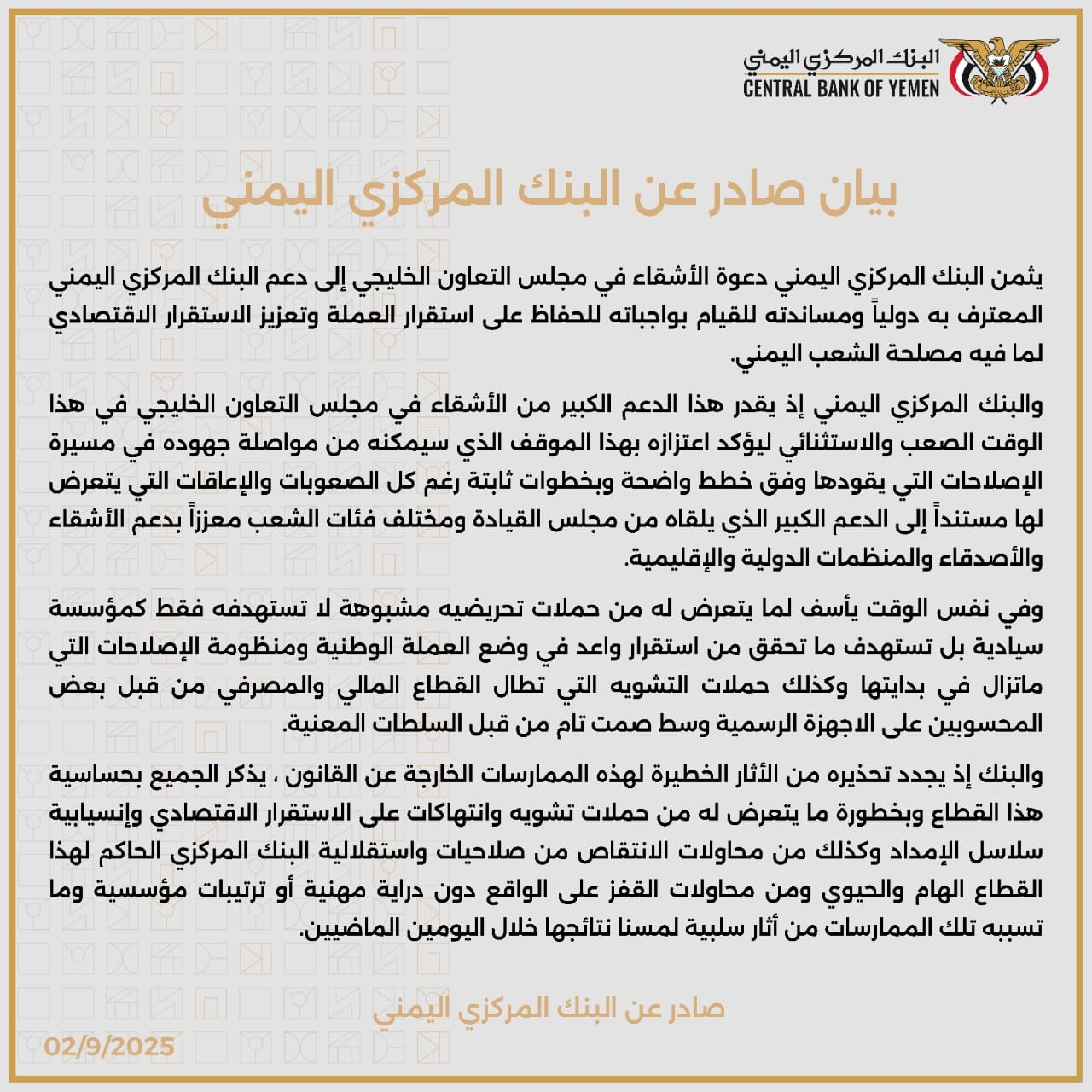 المركزي اليمني يثمّن دعم مجلس التعاون ويحذر من حملات التشويه والتدخلال غير المهنية – وثيقة
