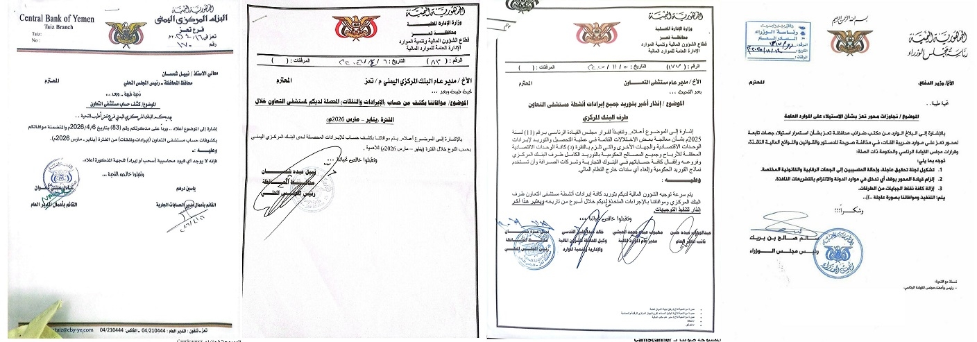 حيث وجه محافظ تعز / نبيل شمسان ، مطلع الشهر الحالي ، خطاباً الى مدير فرع البنك المركزي اليمني بالمحافظ ، لموافاته بكشف من حساب الإيرادات والنفقات المحصلة لدى البنك لمستشفى التعاون الحكومي خلال الفترة يناير - مارس (2026م).