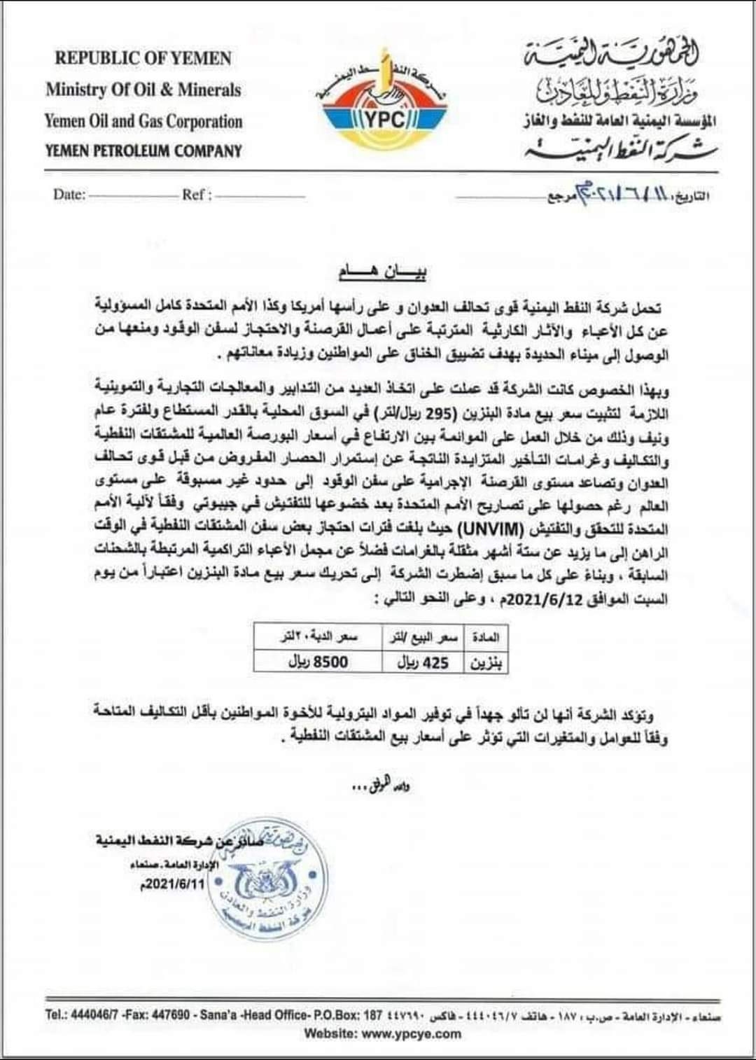 حيث أعلنت شركة النفط الخاضعة لسيطرة مليشيا الحوثي عن بدء بيع مادة البنزين في محطاتها بسعر 8500 ريال للدبة ( مصطلح يمني يطلق على عبوة قياسها 20 لتراً ) في حين يتراوح سعرها بمناطق الشرعية بين 12000-13500 ريال.