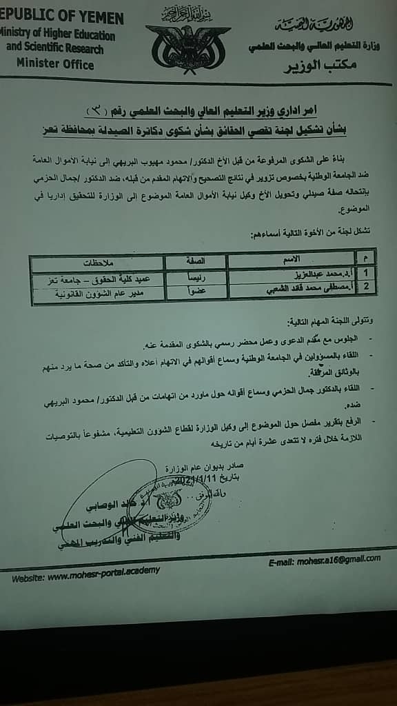 البريهي لفت الى ان النيابة حولت الشكوى الى الوزير للتحقيق والرفع اليها بالنتائج ، ليصدر الوزير الإخواني الاصابي قراراً قضى بتشكيل لجنة تحقيق حول موضوع الشكوى برئاسة الدكتور محمد عبدالعزيز عميد كلية الحقوق بجامعة تعز وعضوية مصطفى الشعبي مدير عام الشئون القانونية بالوزارة.
