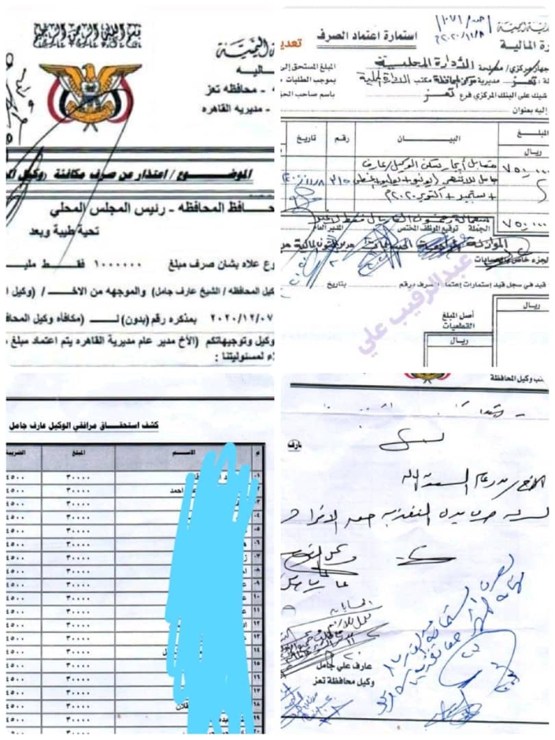 وأضافت المصادر بان هذه المخصصات التي تصل الى ملايين الريالات لا يحصل عليها من بين وكلاء المحافظة سوى عارف جامل والوكيل أول عبدالقوي المخلافي القيادي الإخواني.