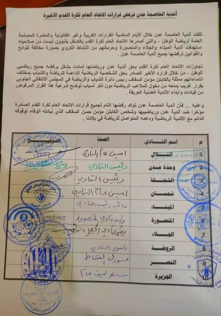 وأعلنت أندية العاصمة عدن رفضها لهذه القرارات، وقالت بأن تجاوزات الاتحاد العام لكرة القدم بحق اندية عدن ورياضتها تمادت بشكل يرفضه جميع رياضيي الوطن.