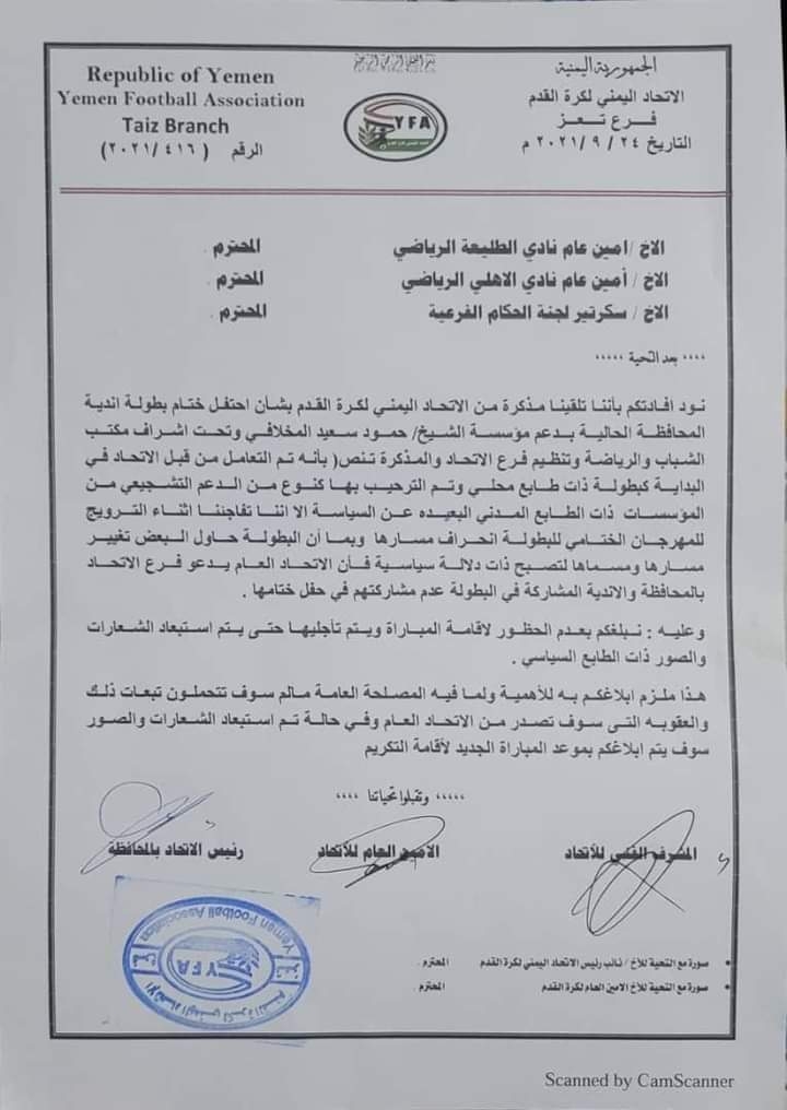 موجهاً كل من ناديي الأهلي والطليعة وكذا الأندية المشاركة في البطولة بعدم الحضور والمشاركة ، وتأجيل المباراة النهائية " حتى يتم استبعاد الشعارات والصور ذات الطابع السياسي " ، وحذر فرع الاتحاد الأندية من مخالفة ذلك والعقوبات التي ستفرض عليها في حالة مشاركتها.
