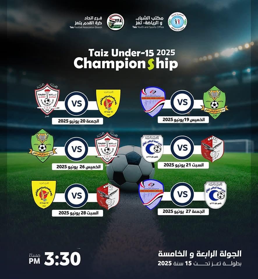 تُستأنف غداً الخميس منافسات بطولة تعز تحت 15 سنة لكرة القدم، بعد توقف مؤقت بسبب إجازة عيد الأضحى ا ...