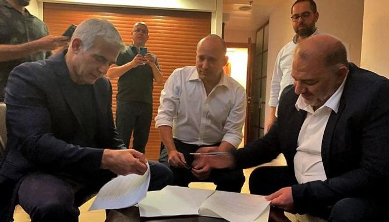 الى جوار نفتالي بينيت الزعيم الإسرائيلي المتطرف ، وقف منصور عباس ر ...
