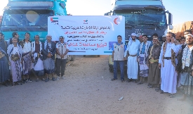 الهلال الأحمر الإماراتي يسيّر قافلة مساعدات غذائية لأهالي مديرية حريب بمأرب