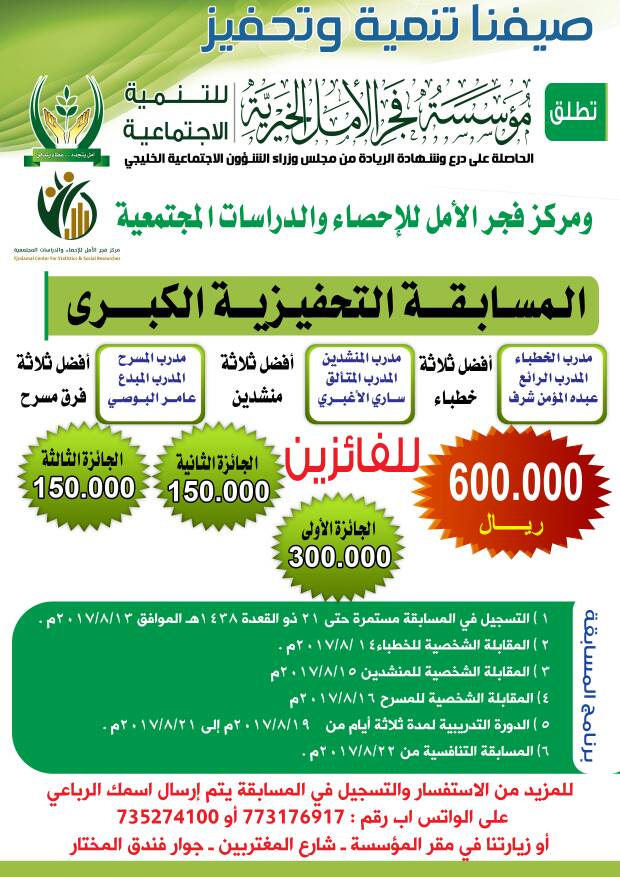 اطلقت مؤسسه فجر الامل الخيرية للتنمية الاجتماعية بتعز الجائزة التحفيزية الكبرى دعما ...