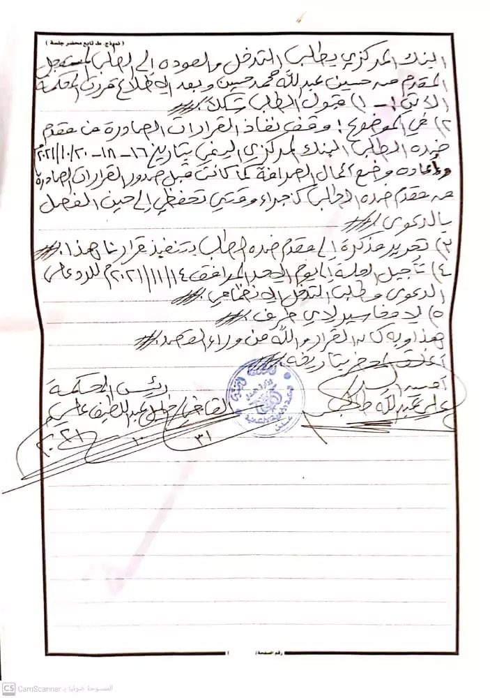 وأقرت المحكمة توجيه خطاب رسمي الى البنك بالحكم الصادر ، مع تأجيل الجلسة إلى يوم الاحد الموافق ١٤/ ١١/ ٢٠٢١م للرد على الدعوى من قبل البنك.