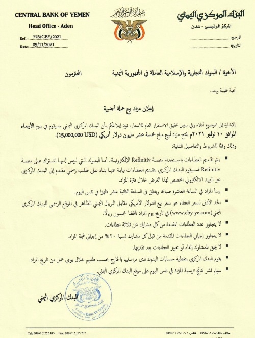 وقال البنك في وثيقة رسمية له بأنه سيفتتح غدا الأربعاء، مزاداً لبيع 15 مليون دولار أمريكي، للبنوك التجارية والإسلامية العاملة في اليمن عبر المنصة.