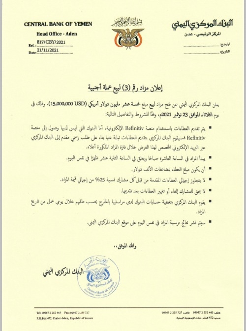 ونشر البنك على موقع الرسمي اليوم الأحد إعلان عن مزاد لبيع 15 مليون دولار امريكي للبنوك عبر المنصة الإلكترونية ريفينتيف (Refinitiv) ، وذلك يوم الثلاثاء القادم.