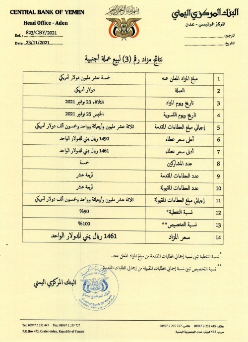 أعلن البنك المركزي في عدن عن نتائج المزاد الثالث لبيع العملة الصعبة وعودة بعض شركات الصرافة للعمل.