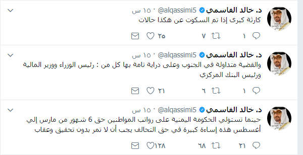 وقال الدكتور خالد القاسمي في تغريدات له على " تويتر " بأن الحكومة الشرعية استولت على رواتب موظفي الدولة والجيش لـ 6 أشهر من شهر مارس إلى أغسطس الماضي.