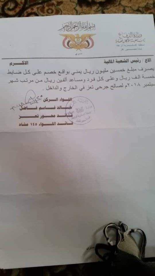 في حين تقوم قيادة محور تعز – وبحسب الوثيقة المنشورة في هذا التقرير – ومنذ منذ بداية تسلم رواتب العسكريين باستقطاع مبلغ خمسة الالاف ريال شهريا من راتب ضباط الجيش و مبلغ الفين ريالا شهريا على كل مجند في الجيش بحجة علاج الجرحى.