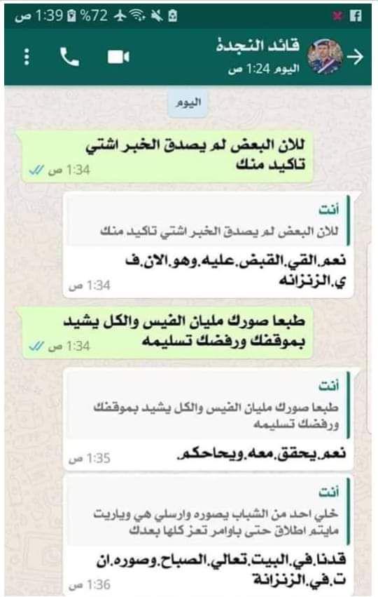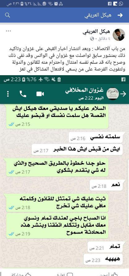 وفي المحادثة يؤكد غزوان المخلافي قيامه بتسليم نفسه طواعيا ، مبديا سخريته من ادعاءات الامن والجيش بالقبض عليه.