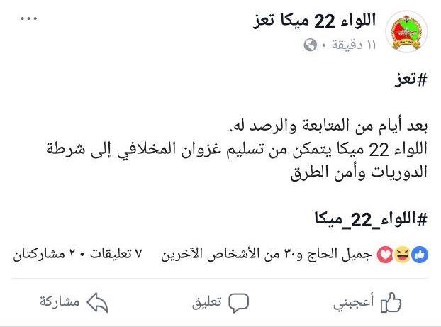 وادعى اللواء 22 بأن القبض عليه جاء بعد " ايام من المتابعة والرصد له " وانه قام بتسليمه الى شرطة الدوريات وأمن الطرقات ، وهو ما أكده قائد شرطة الدوريات.