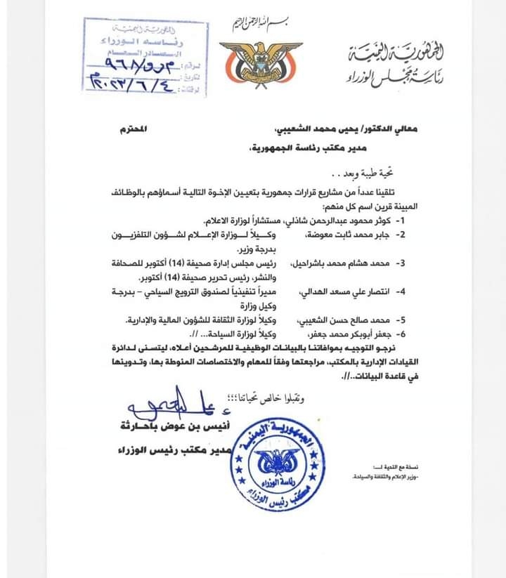 وكشفت وثيقة رسمية صادر عن مدير مكتب رئيس الوزراء وموجهة الى مدير مكتب رئاسة الجمهورية ، عن مشاريع قرارات جمهورية بتعيين وكلاء لوزارات الاعلام والسياحة والثقافة التي يرأسها الوزير معمر الارياني ، بالإضافة الى مستشار للوزير ومدراء لمؤسسات تابعة للوزارة.