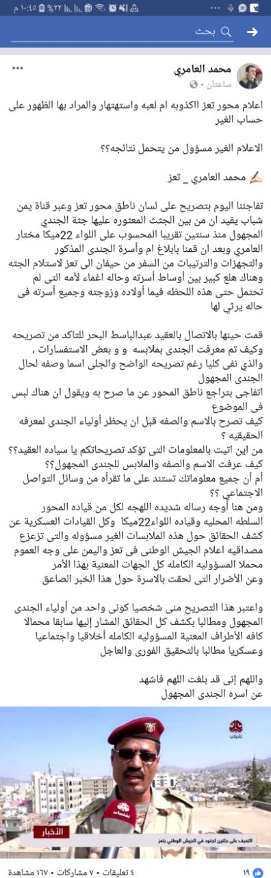 وكشف العامري في منشور له على صفحته على الفيس بأن تواصل مع العقيد البحر للاستفسار منه حول تصريحاته وكيف تم التعرف على الجندي.