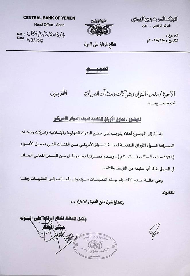 ووجه البنك من العاصمة عدن بقبول إصدارات الدولار الامريكي التي تحمل الأعوام (1999 – 2001 – 2003 – 2006) ، كما وجه بعدم صرفها بسعر أقل من السعر السائد في السوق طالما أنها سليمة من التزييف والتلف.