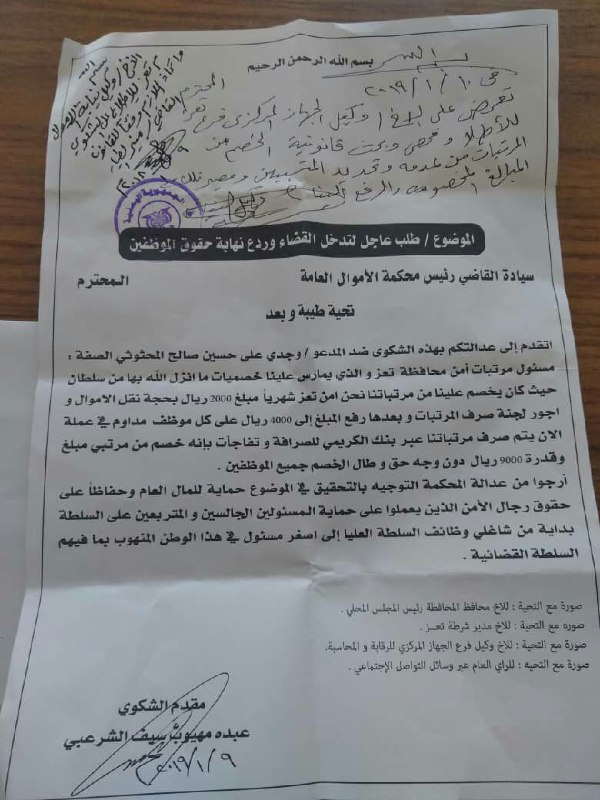 من جانب آخر وجهت نيابة الأموال العامة في تعز الجهاز المركزي للرقابة والمحاسبة بالنظر في شكوى الخصميات بحق رواتب أفراد الأمن.