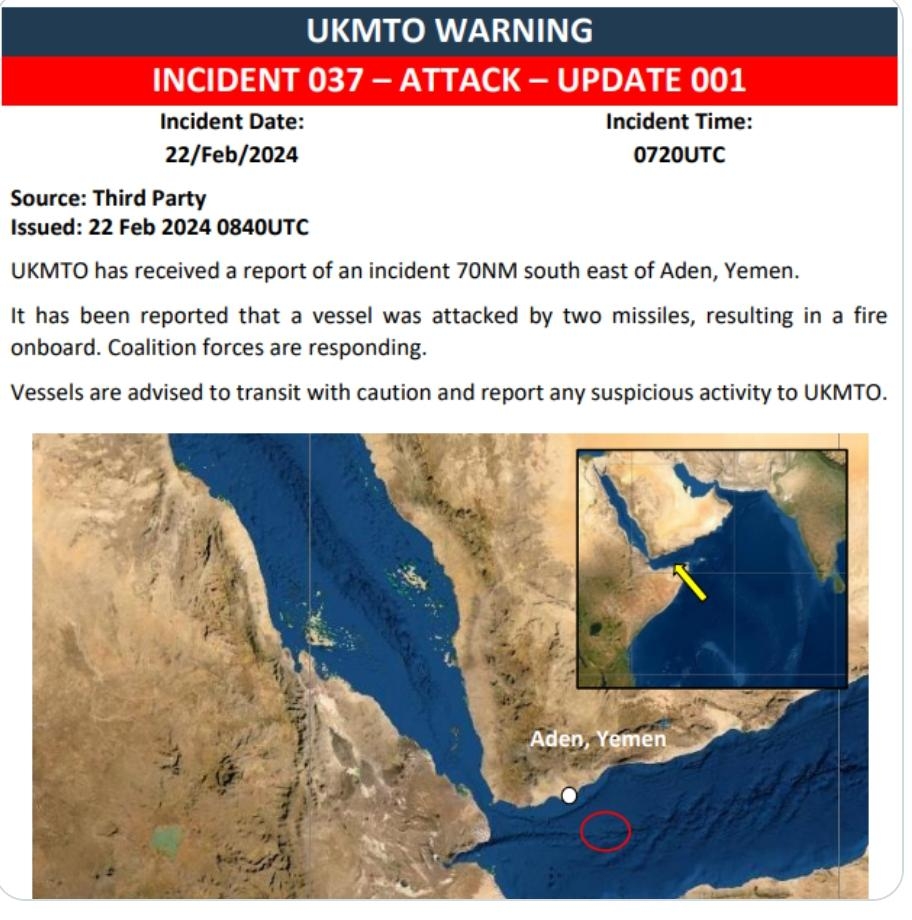 اعلنت هيئة التجارة البحرية البريطانية، تلقيها بلاغا عن حادث على بعد 70 ميلا بحريا إلى الجنوب الشرقي من مدينة عدن، حيث تعرضت سفينة لهجوم بصاروخين ما أدى لنشوب حريق فيها.
