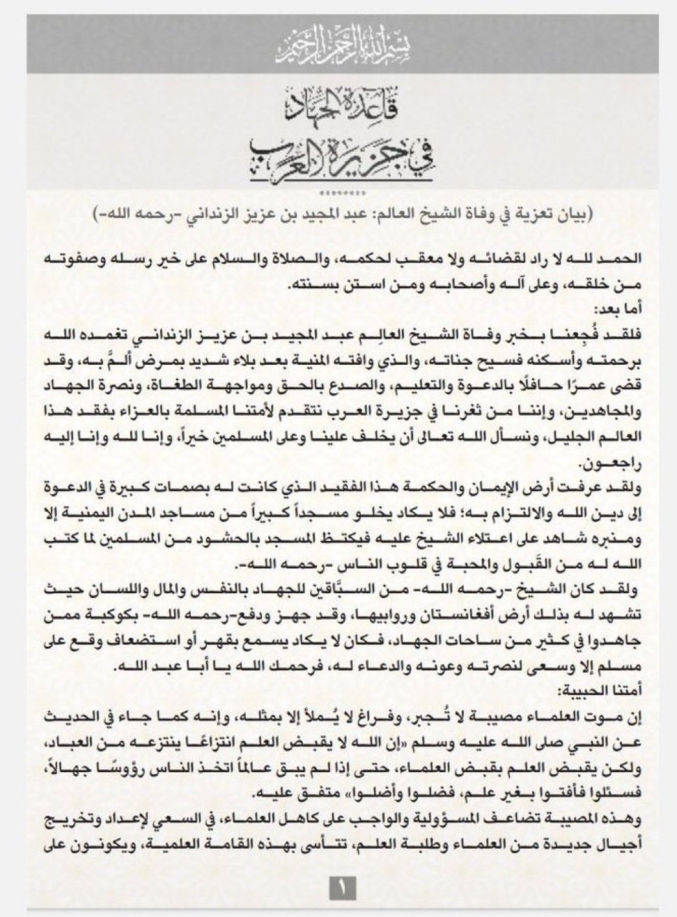 أصدر تنظيم القاعدة في جزيرة العرب (الفرع اليمني) بيان نعي بوفاة القيادي البارز بجماعة الاخوان الشيخ عبدالمجيد الزنداني الذي توفي الاثنين الماضي في تركيا.