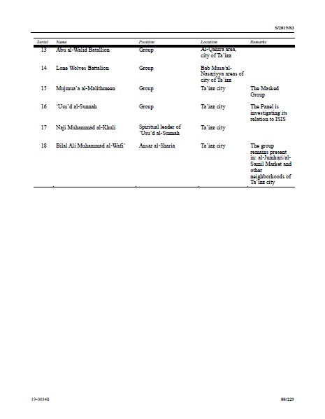 1- شباب دولة الخلافة الاسلامية / جماعة / مدينة تعز/ لا يزال الفريق يحقق في علاقتها بجماعات خارج اليمن
