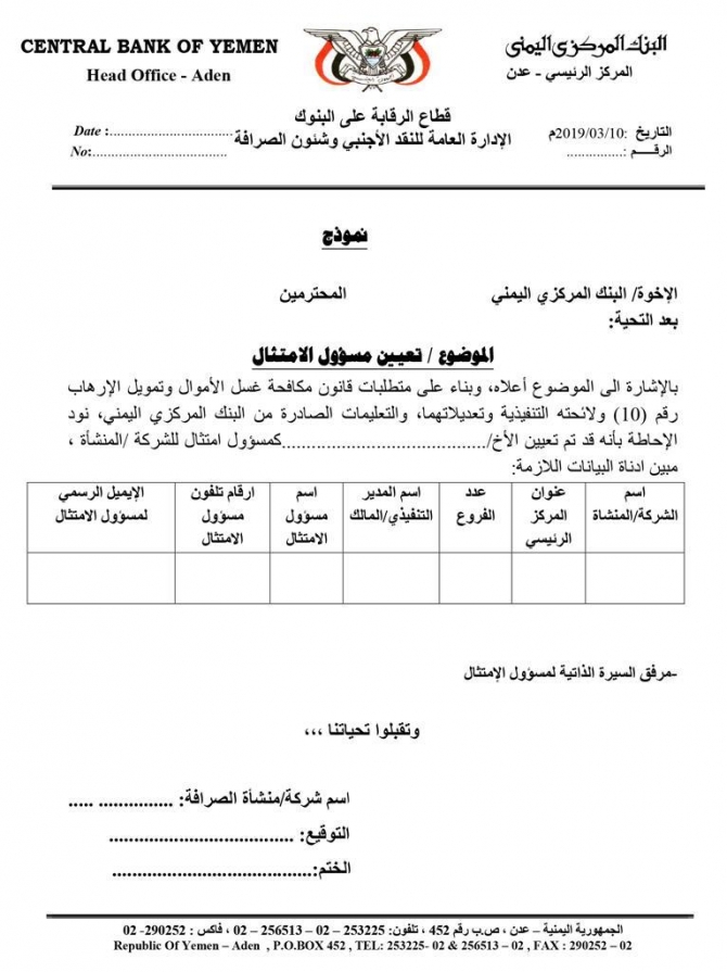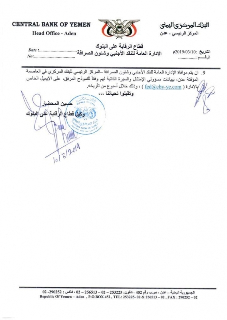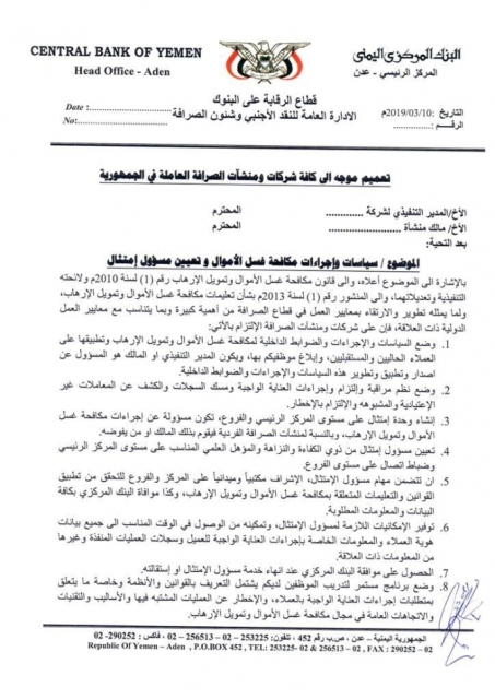 وجه البنك المركزي اليمني بالعاصمة المؤقتة عدن، اليوم الأحد، تعميم هام إلى شركات ومنشآت الصرافة في جميع المحافظات اليمنية.