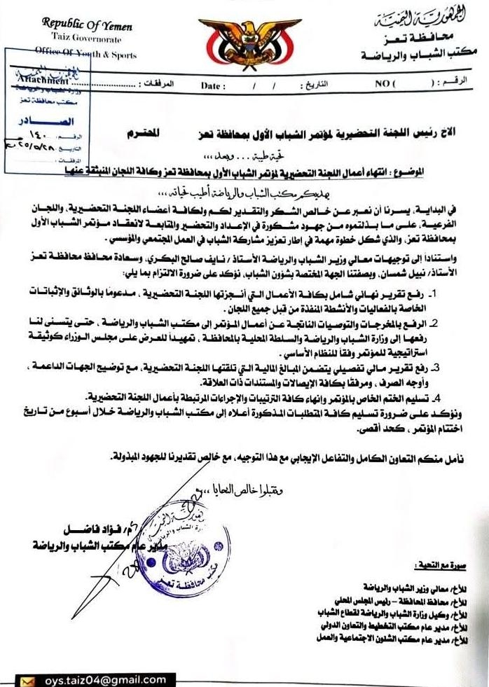 وأكد مدير مكتب الشباب والرياضة، د. فؤاد فاضل، في مذكرة رسمية بعث بها إلى رئيس اللجنة التحضيرية، على ضرورة الالتزام برفع تقرير نهائي شامل بكافة الأعمال التي أنجزتها اللجنة التحضيرية، مدعوماً بالوثائق والإثباتات الخاصة بالفعاليات والأنشطة المنفذة.