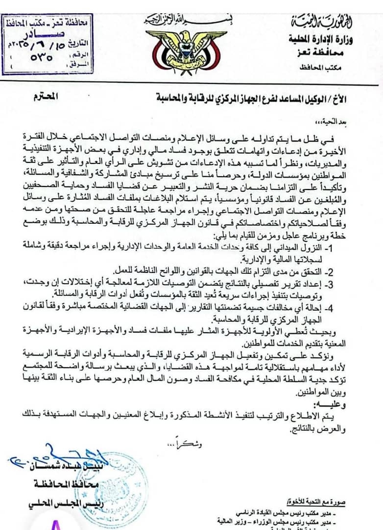 محافظ تعز يطالب الجهاز المركزي للرقابة والمحاسبة باستلام بلاغات الفساد المثارة إعلامياً ومراجعتها بشكل عاجل- وثيقة