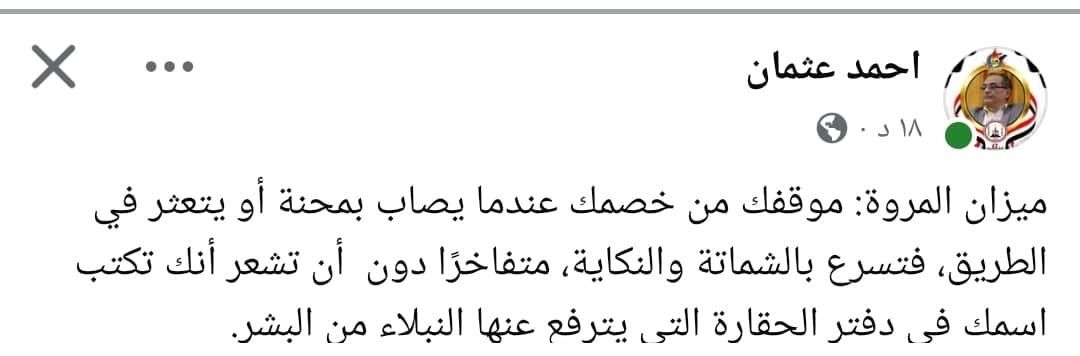 في منشور له على صفحته بمنصة "فيس بوك" ، يُقدم المسئول الإعلامي لفرع حزب الإصلاح (إخوان اليمن) بتعز احمد عثمان ، ما يُشبه الموعظة الأخلاقية عما يُسميه "ميزان المروة" ، لكنها تعكس في حقيقتها تلخيصاً للأزمة التي يعيشها حزبه بالمحافظة وجماعته على مستوى اليمن والمنطقة.