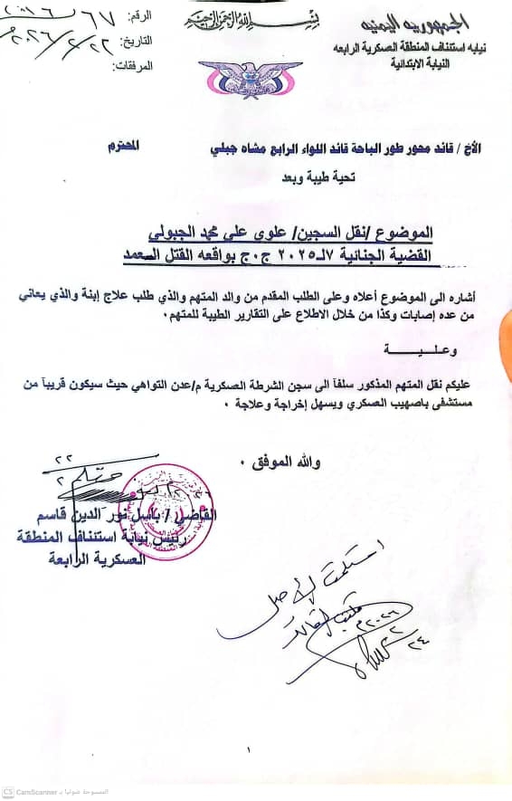 وبحسب الوثيقة، فإن والد المتهم علوي الجبولي كان قد تقدّم بطلب نقله، مبررًا ذلك بتعرّض نجله لعدة إصابات تستدعي الرعاية الطبية، كما أكدت الوثيقة أن النيابة اطّلعت على تقارير طبية تثبت ذلك.