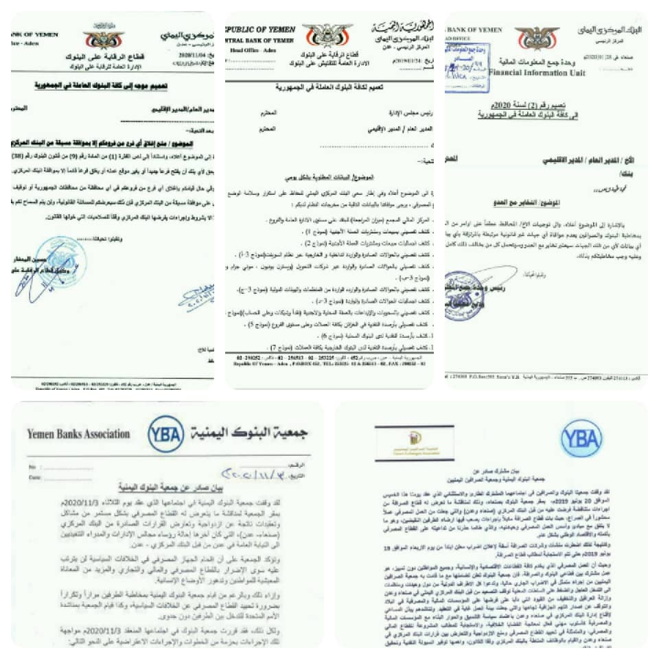 وفي يناير من العام 2020 وجّه البنك المركزي في صنعاء أمراً مباشراً إلى كافة البنوك وشركات الصرافة تمنعهم من التعامل مع مركزي عدن، وأن من يسلم بياناته سوف يتعرض للسجن والمحاكمة بتهمة "التخابر مع العدو". (انظر وثيقة 3 قرار البنك المركزي صنعاء)