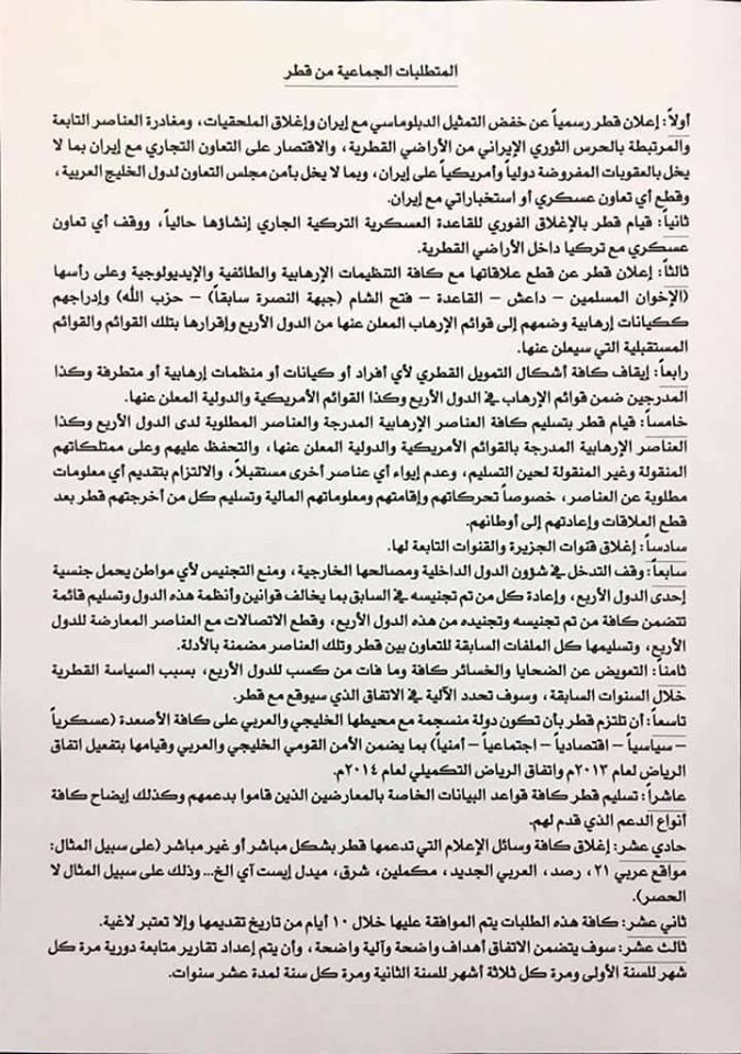 قدمت الدول المقاطعة لقطر ( السعودية – الامارات – البحرين – مصر ) قائمة من 13 مطلباً للدوحة وأمهلتها 10 أيام لتنفيذها، من أجل إنهاء الأزمة الحالية .