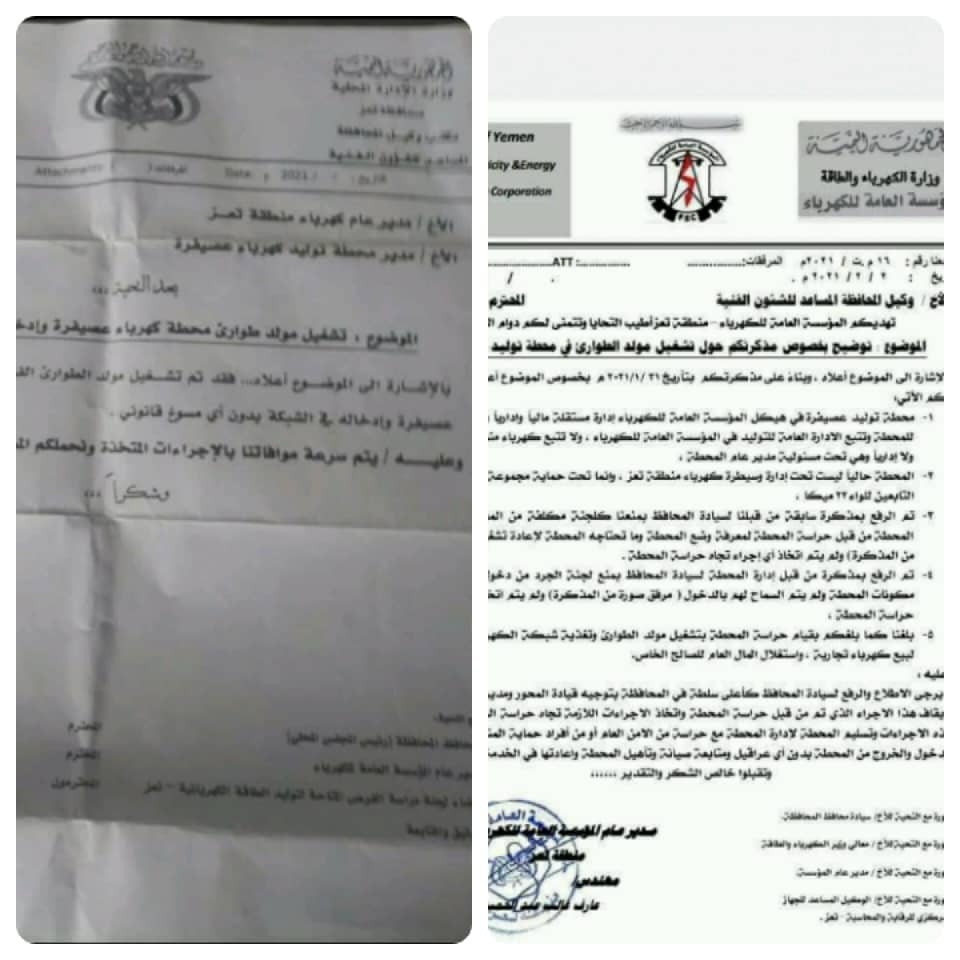 وطالبت مؤسسة الكهرباء في منطقة تعز قيادة المحافظة بإلزام قيادة المحور الخاضع لسيطرة المليشيا الإخوانية الإرهابية بتسليم المحطة لأفراد امن يتبعون شرطة حماية المنشآت وتسليم المحطة لإدارتها، مشيرة إلى الحاجة لصيانتها وتأهيلها.