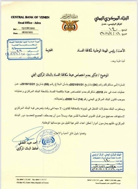 وثيقة : البنك المركزي بعدن يرفض التعامل مع هيئة مكافحة الفساد