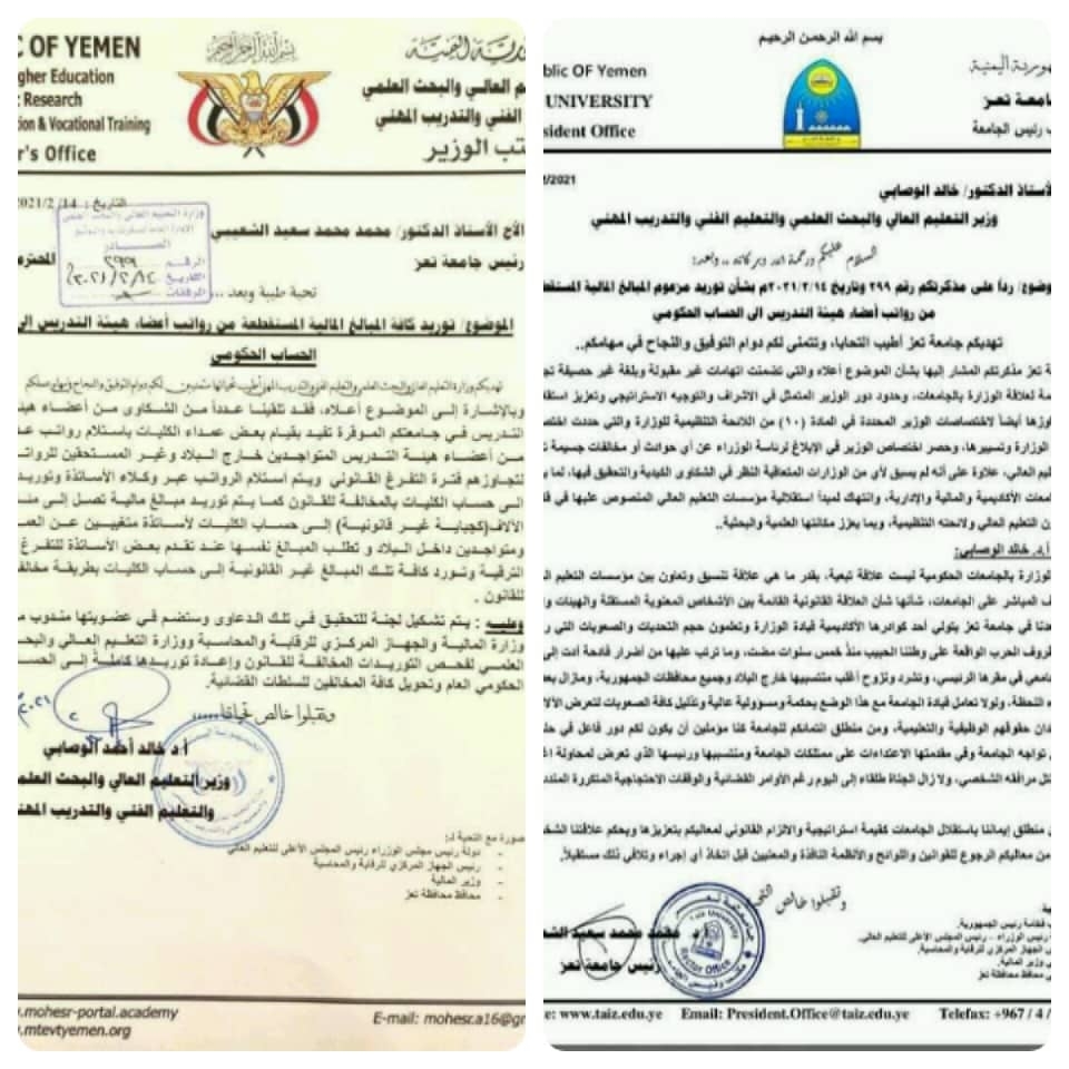 وزير التعليم العالي الاخواني خالد الوصابي أشار في رسالته الى رئيس جامعة تعز الى وجود شكاوى من أعضاء هيئة التدريس بالجامعة بقيام عمداء الكليات باستلام رواتب المتواجدين خارج البلاد وتوريدها لحساب الكليات.