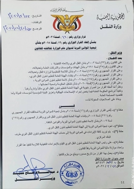 ونص القرار أيضا على أن يتم توريد كافة الإيرادات في الموانئ البرية إلى حساب الهيئة العامة لتنظيم شؤون النقل البري في البنك المركزي اليمني ، كما ونص القرار أيضا على رئيس الهيئة العامة لتنظيم شؤون النقل البري القيام بالإجراءات التنفيذية.
