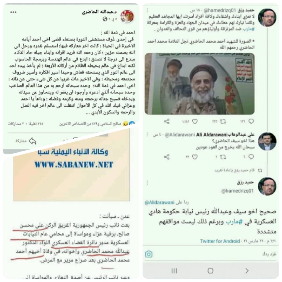 ونشر القيادي الحوثي حميد رزق صورة الحاضري مؤكدا بأنه قتل في معركة مارب ضد "المرتزقة وأولياؤهم من قوى التحالف والعدوان " ، حد قوله.