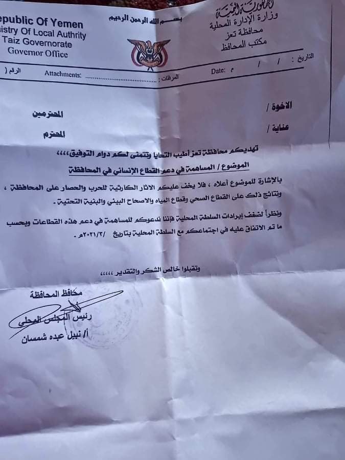 وحصل "الرصيف برس" على وثيقة موقعة من الوكيل جامل وموجهة بشكل مفتوح الى طلب باسم السلطة المحلية بالمساهمة في " دعم القطاع الإنساني في المحافظة" ، مع الإشارة الى "الاثار الكارثية للحرب والحصار على القطاع الصحي والمياه والاصحاح البيئي والبنية التحتية".