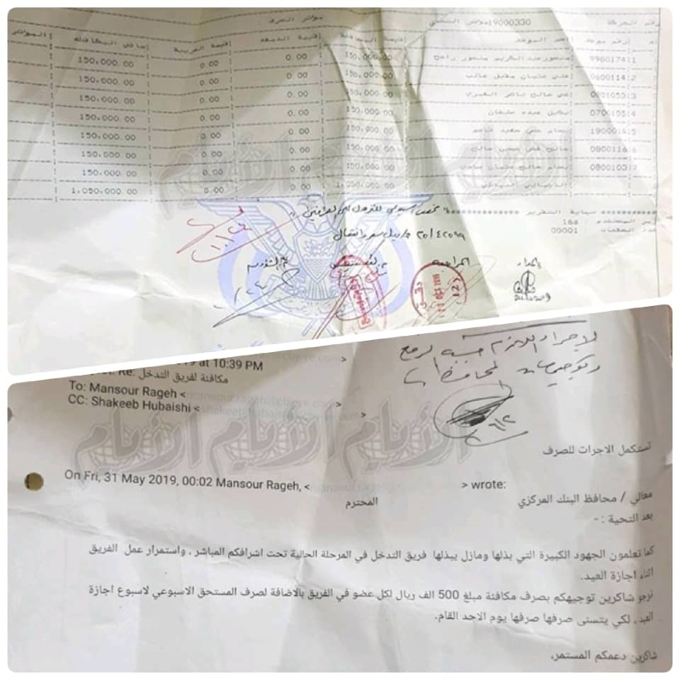 ونشرت الصحيفة وثائق تتعلق بمراسلات داخلية في البنك المركزي اليمني تظهر قيام محافظ البنك حافظ فاخر معياد في العام 2019 بصرف مبلغ 25 مليون ومائتي ألف ريال لسبعة أشخاص بمعدل 150 ألف ريال أسبوعيا وهم قوام ما يعرف بـ«لجنة التدخل».