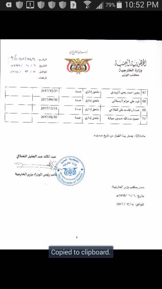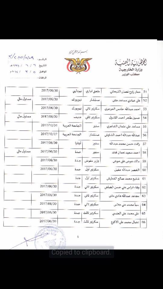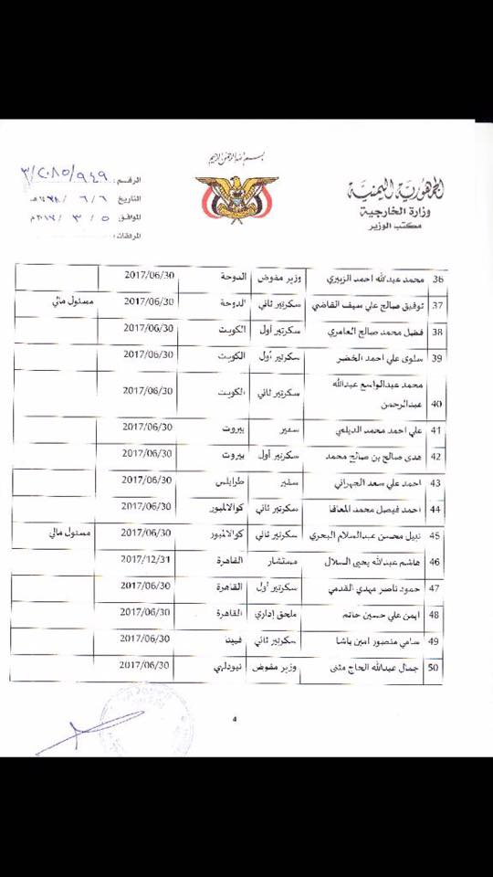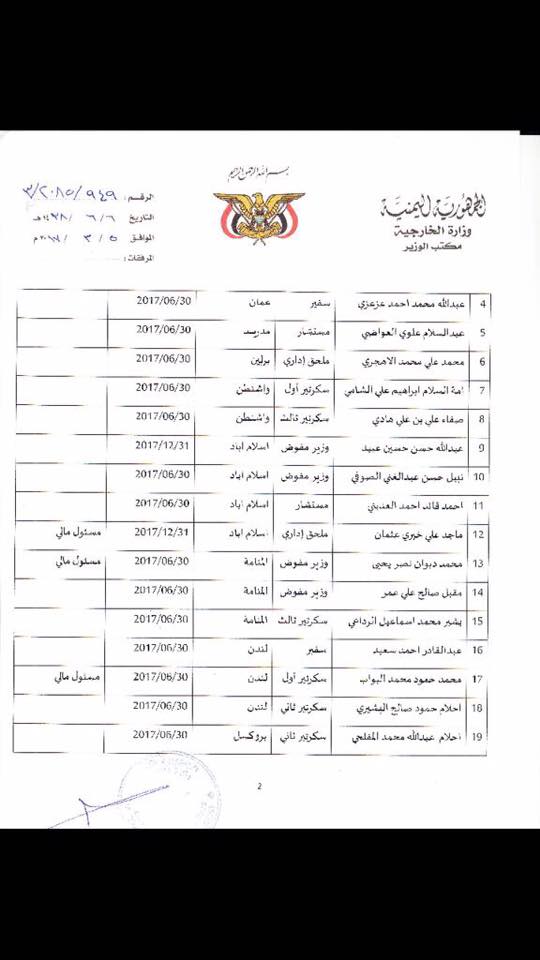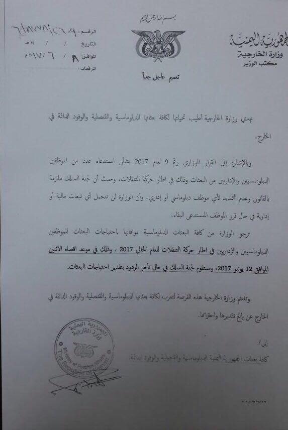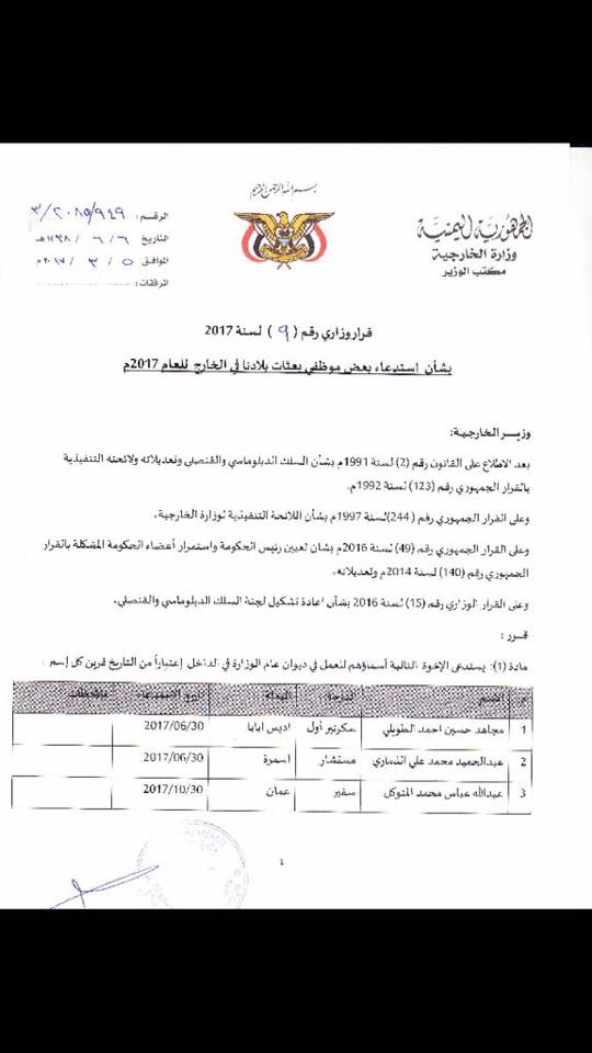 الاسيدي نشر كشوفات لقرار وزير الخارجية عبدالملك المخلافي باستدعاء عشرات الدبلوماسيين ممن انتهت فترة اعمالهم مطالبا اياهم بالعودة الى الداخل رغم النتائج الخطرة المترتبة على تلك العودة خاصة وانهم كانوا يمثلون الشرعية.