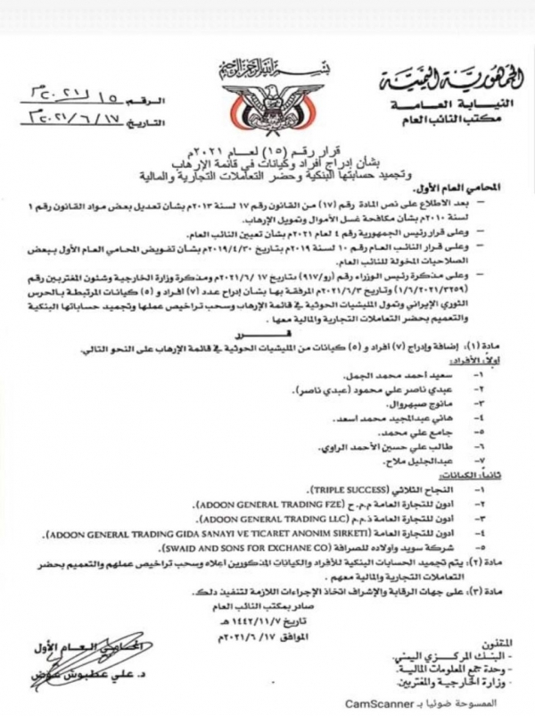 وأصدر النائب العام في عدن قرارا باضافة وادراج سبعة أفراد وخمسة كيانات يعملون في مجال التجارة والصرافة إلى قوائم الإرهاب وتجميد الحسابات.