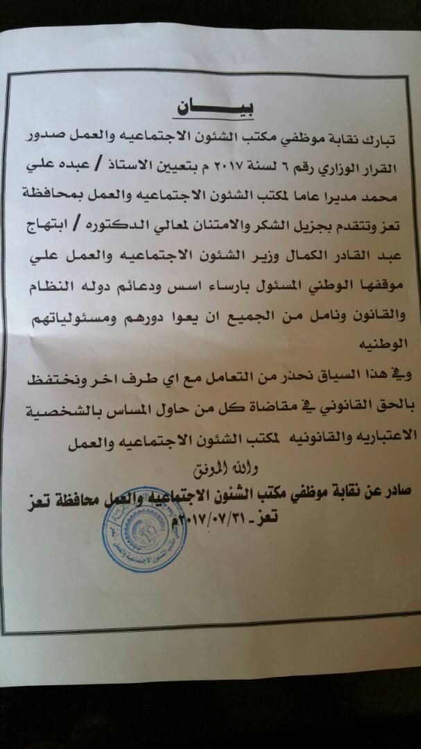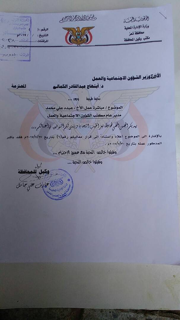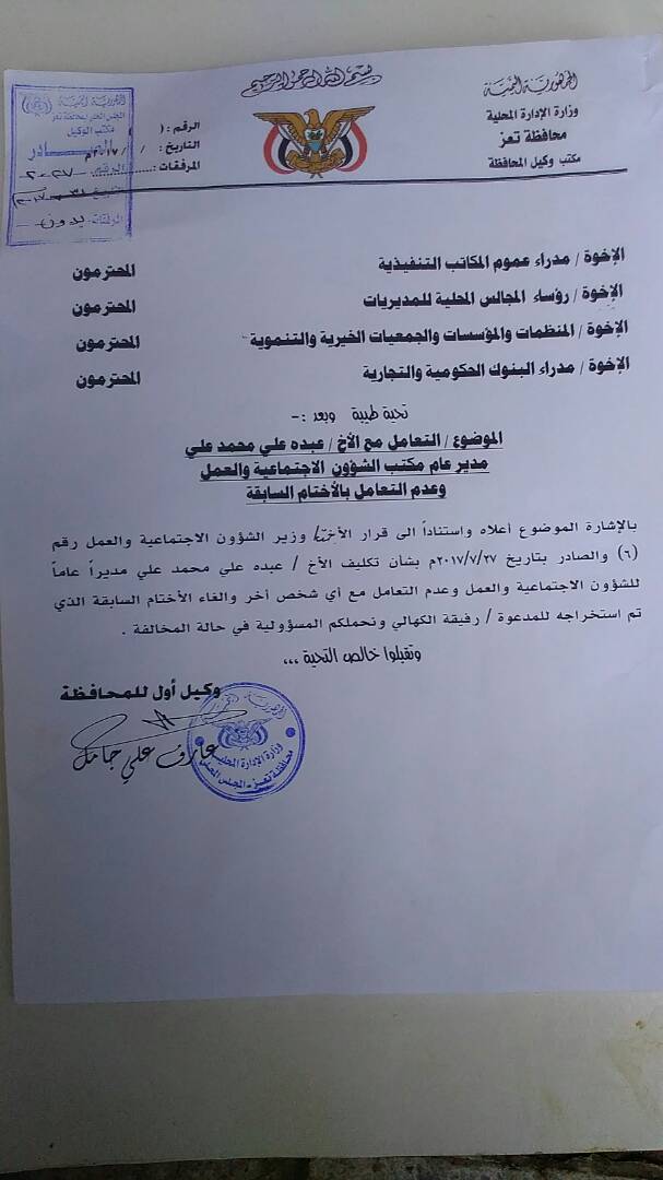كما أصدر جامل ايضا تعميما لمدراء عموم المكاتب التنفيذية بالمحافظة ولرؤساء المجلس المحلية بالمديريات وللمنظمات وكذا للبنوك بالتعامل مع المعين من قبل الوزيرة والغاء الاختام التي تم استخراجها من قبل رفيقة الكهالي المكلفة من قبل المحافظ.