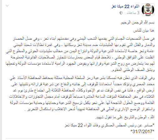 وفي الوقت الذي دعا فيه قائد اللواء 22 ميكا وكلاء المحافظة الثلاثة الى اجتماع يوم غدا للوقوف امام هذه التجاوزات، اعلن فيه تأييد الكامل لشرعية المحافظ المعمري وقرارته.