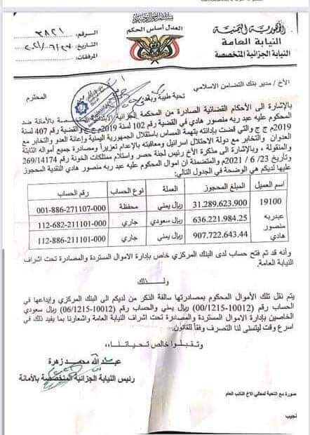 حيث كشفت وثيقة صادرة عن النيابة في صنعاء مطالبتها بأرصدة في البنك باسم الرئيس هادي تحوي مبالغ تصل الى نحو مليار ريال سعودي.