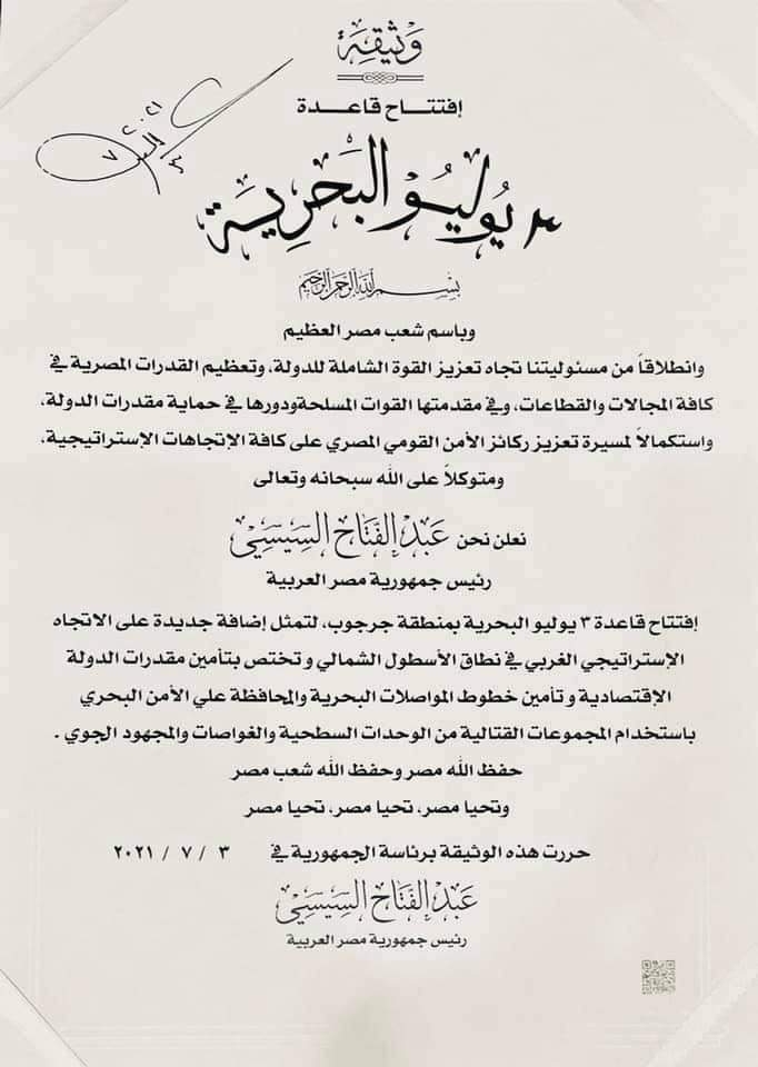 وقع الرئيس المصري عبد الفتاح السيسي، السبت، وثيقة إنشاء قاعدة "3 يوليو" البحرية بمنطقة جرجوب على الساحل الشمالي الغربي.
