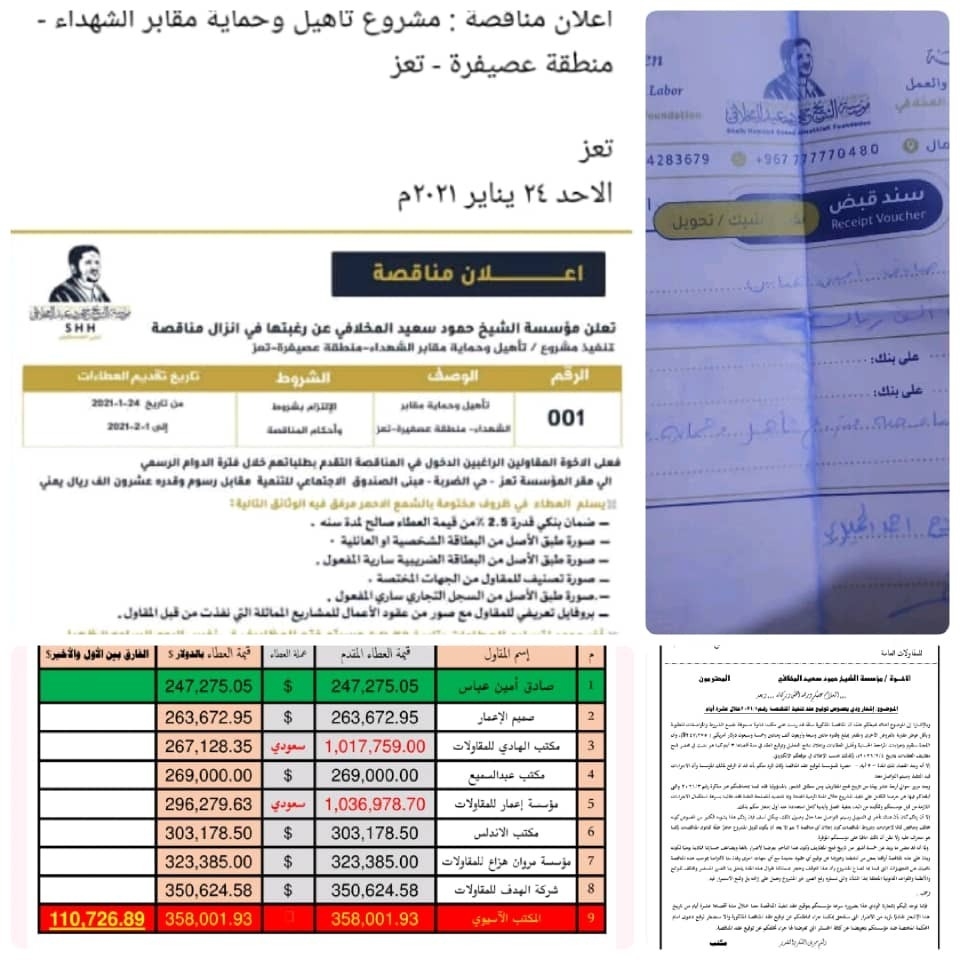 موضحة بأن مؤسسة المخلافي تعاقدت مع المقاول عبدالله عبدالملك -شقيق القيادي الإخواني توفيق عبدالملك الحميدي- بمبلغ 358 ألف دولار دون إشعار مكتب المقاول صادق أمين عباس الذي رست عليه المناقصة.