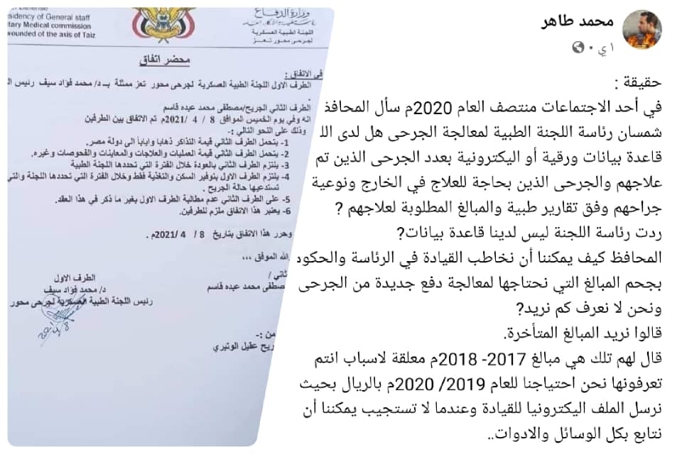 وكشف مدير وكالة "سبأ" الحكومية في تعز محمد طاهر عن تفاصيل اجتماع تم منتصف العام الماضي بين المحافظ نبيل شمسان ورئاسة اللجنة الطبية لمعالجة الجرحى التابعة لمحور تعز.