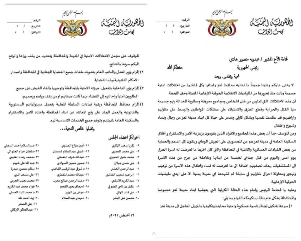 وأشار النواب في رسالتهم إلى الاختلالات الأمنية التي "تمارس من قبل أشخاص ومجاميع معروفة ومطلوبة للعدالة بتهم جسيمة منها القتل والحرابة وقطع الطرق والإستيلاء على ممتلكات المواطنين والبسط على منازلهم وأراضيهم، قد عكست نفسها وبشكل كارثي ومدمر على حياة كل أبناء مدينة تعز من رجال ونساء وشيوخ وأطفال " بحسب الرسالة.