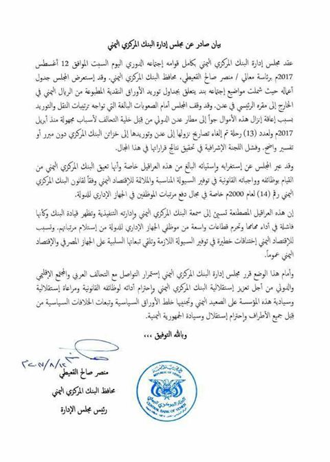 واختتم المحافظ بيانه:" أمام هذا الوضع قرر مجلس إدارة البنك المركزي اليمني إستمرار التواصل مع التحالف العربي والمجتمع الإقليمي والدولي من أجل تعزيز إستقلالية البنك المركزي اليمني وإحترام أدائه لوظائفه القانونية ومراعاة إستقلالية وسيادية هذه المؤسسة على الصعيد اليمني وتجنيبها خلط الأوراق السياسية وتبعات الخلافات السياسية من قِبَل جميع الأطراف وإحترام استقلال وسيادة الجمهورية اليمنية.